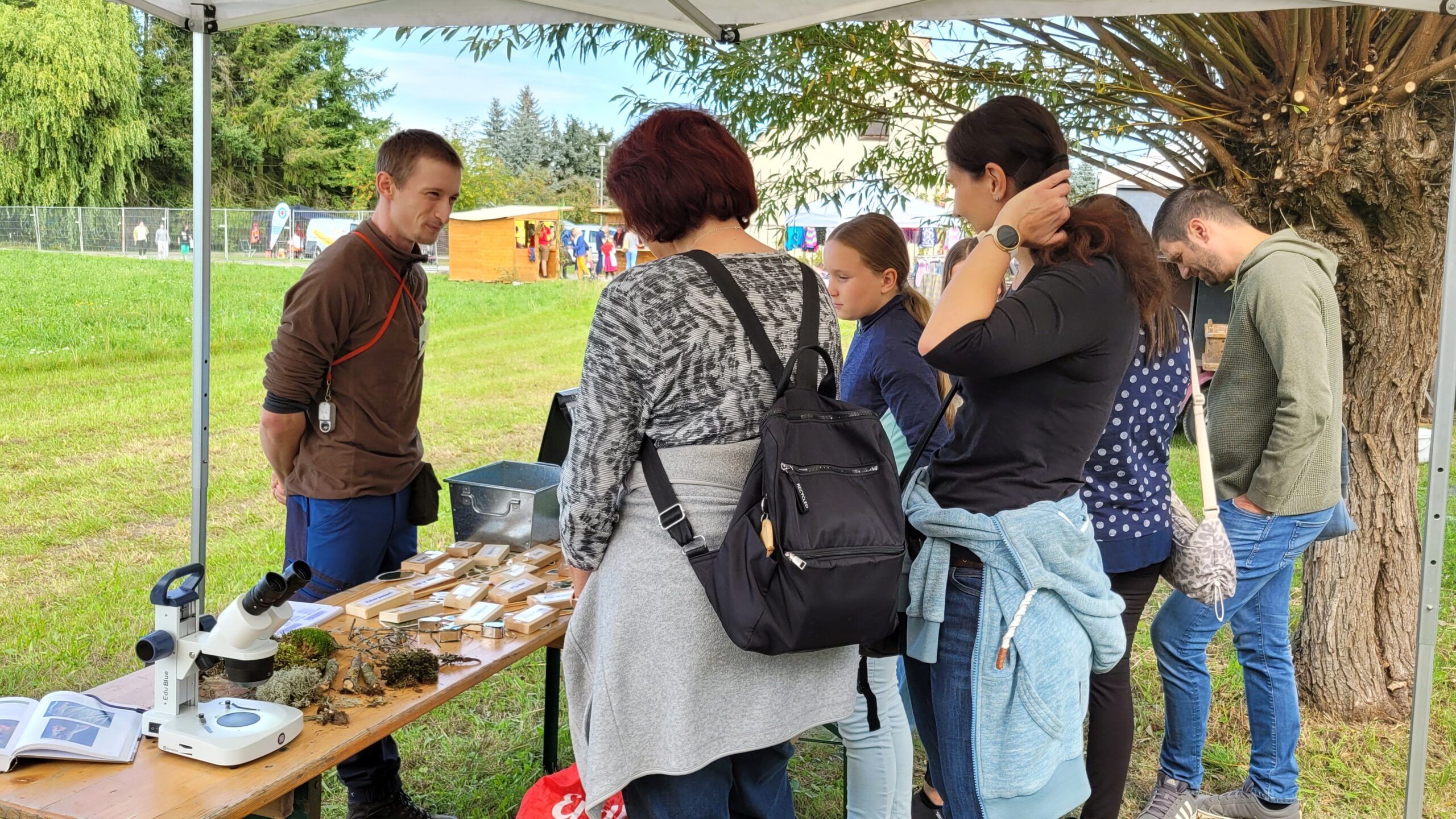 Thematisch passende Einzelveranstaltungen wie beispielsweise das Schulfest der Neiße-Grundschule Görlitz im Juni unter dem Titel „Wald, Wiese und Natur“ boten die Möglichkeit, schon die Kleinsten und ihre interessierten Eltern für die Anliegen unserer Initiative zu begeistern. Dabei wurden die Themen Biodiversität und deren Erforschung in kindgerechte Formate übertragen: Ein Baumarten-Memory vermittelte den Artenreichtum einheimischer Gehölze, verschiedenste Moose und Flechten konnten in Becherlupen betrachtet oder unter dem Binokular erforscht und eigene Proben auf dem Gelände gesammelt werden. Ergänzend dazu gab es auch ein kleines Kreativ-Angebot, bei dem die Kinder selbst Buttons zum Anstecken mit extra für die Initiative Oberlausitzer Zukunftswald erarbeiteten Motiven gestalten konnten.